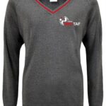 Choice of dark grey V-neck jumper or cardigan with red trim