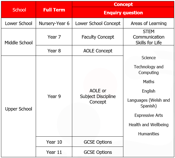 At Ysgol Bro Taf, curriculum design is underpinned by a range of concepts carefully considered from what matter statements and developed through pupil voice. The concepts progress throughout the school and will be refined to Areas of Learning appropriate for each stage. Each concept is underpinned by an enquiry question to allow pupils to deepen their learning and create a culture of enquiry, investigation and analysis.