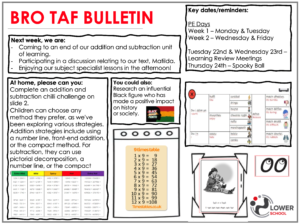 ‘Next week we are’: Informs Parents/Carers what their child will be learning about the following week.